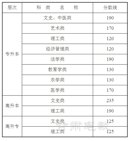 2024年甘肃成人高考招生录取控制分数线公布
