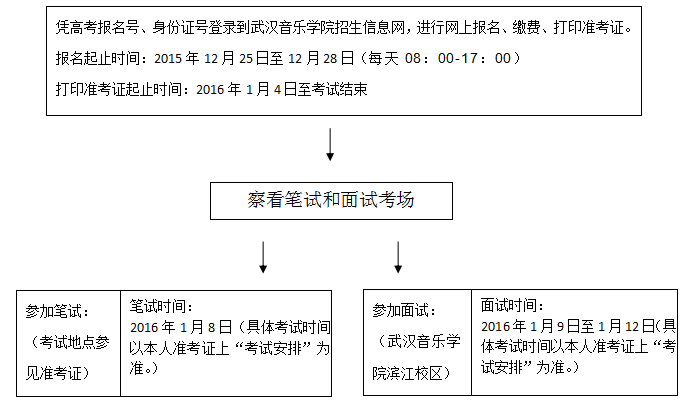在高考网报时已选报音乐学类统考的考生,于2015年12月25日至12月28日(每天08:00-17:00),凭高考报名号和身份证号登录武汉音乐学院招生信息网进行专业统考报名,填报相应科目的考试曲目和网上缴费。请考生务必在规定时间内进行曲目填报和缴费工作,以免错过网报时间。网报结束后,系统将自动关闭,未在规定时间内进行曲目填报和网上缴费的考生,视为未报名,不予以安排考试。