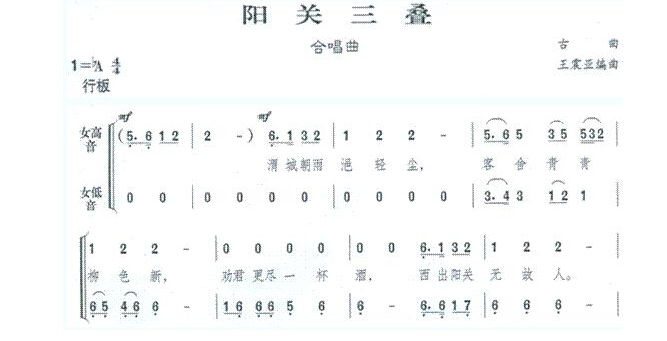 《阳关三叠》是古代文人有感于一位从军朋友的别离之情而写的歌曲,它含蓄地反映了人民在不合理的征戍徭役制度压迫下的哀怨情绪。全曲分三大段,基本上用一个曲调作变化反复,叠唱三次。这首琴歌的音调纯朴而富有激情,特别是后段“遄行,遄行”等处的八度大跳,以及“历苦辛”处的连续反复呈述,情意真切,激动而沉郁,充分表达出作者对即将远行的友人那种无限关怀、留恋的诚挚情感。1954年王震亚将此曲改编为合唱曲。