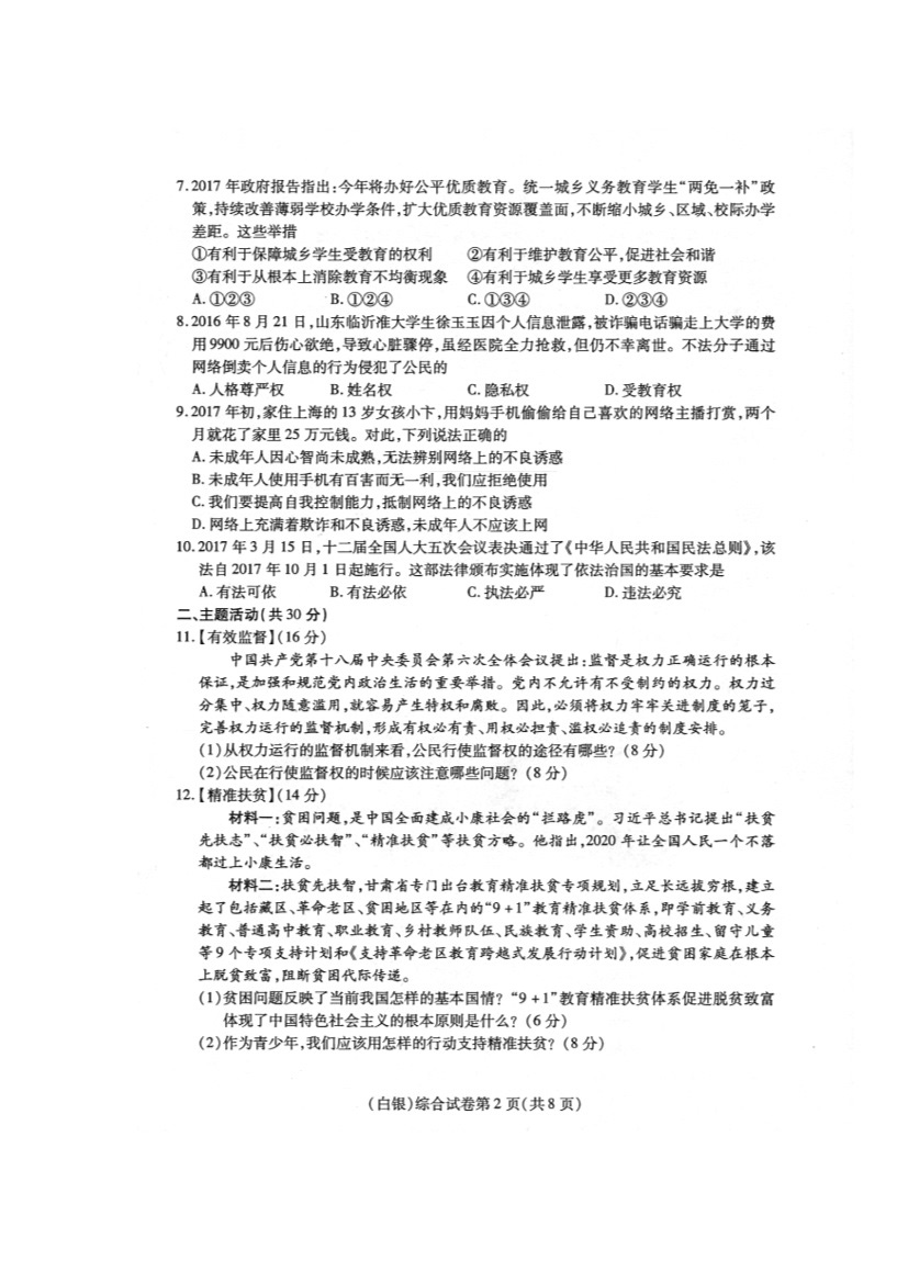人生处处是考场,今日各为中考忙。斗智斗勇齐亮相,得失成败走一场。考场潇洒不虚枉,多年以后话沧桑!2017年甘肃临夏中考政治科目考试已落下帷幕,©无忧考网在考后第一时间提供甘肃临夏中考政治试卷及答案解析,供广大考生参考估分。预祝各位考生取得优异的成绩,顺利考入理想的高中!