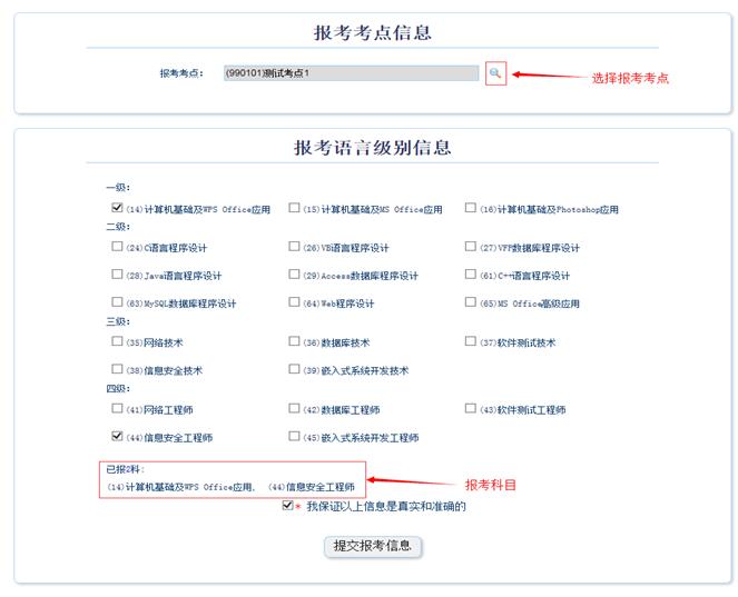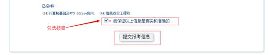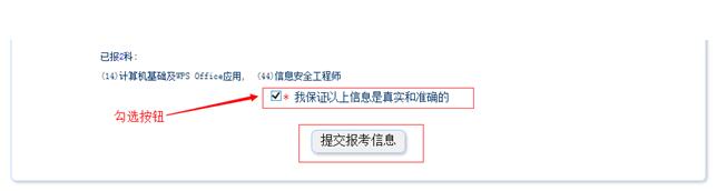 选择完科目后,科目列表下方会显示已报考的科目。考生确认基本信息和报考科目无误后,勾选“我保证以上信息是真实和准确的”,点击“提交报考信息”按钮,进入下一步。