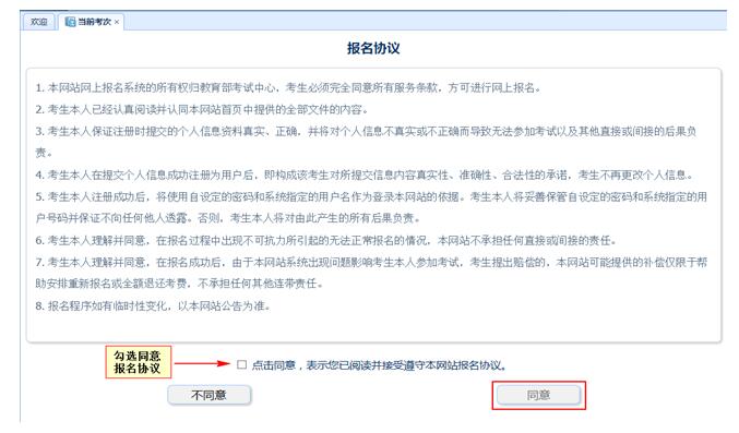 点击左侧导航栏中“当前考次”菜单即可阅读《报名协议》,勾选“同意报名协议”复选框,点击“同意”按钮,即可进行下一步;若点击“不同意”按钮,可中止报名。