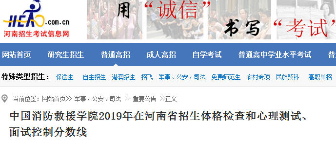 中国消防救援学院2019年在河南省招生体格检查和心理测试、面试控制分数线